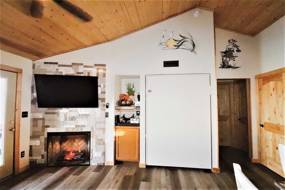 Pet-friendly lake stay just 2 traffic free miles from Silver Dollar City and 1 mile from Indian Point Marina! The GLO Getaway features a cozy king bed, fireplace, full kitchen, and private balcony. Walking trail nearby leads to a peaceful lake cove. Kayak and paddleboard rentals available, plus discounted GloRide experiences. Quiet location with boat parking, close to food, live music, and 15 to 20 min drive to Branson attractions. Visit ExploreIndianPoint for more info on GloRides.