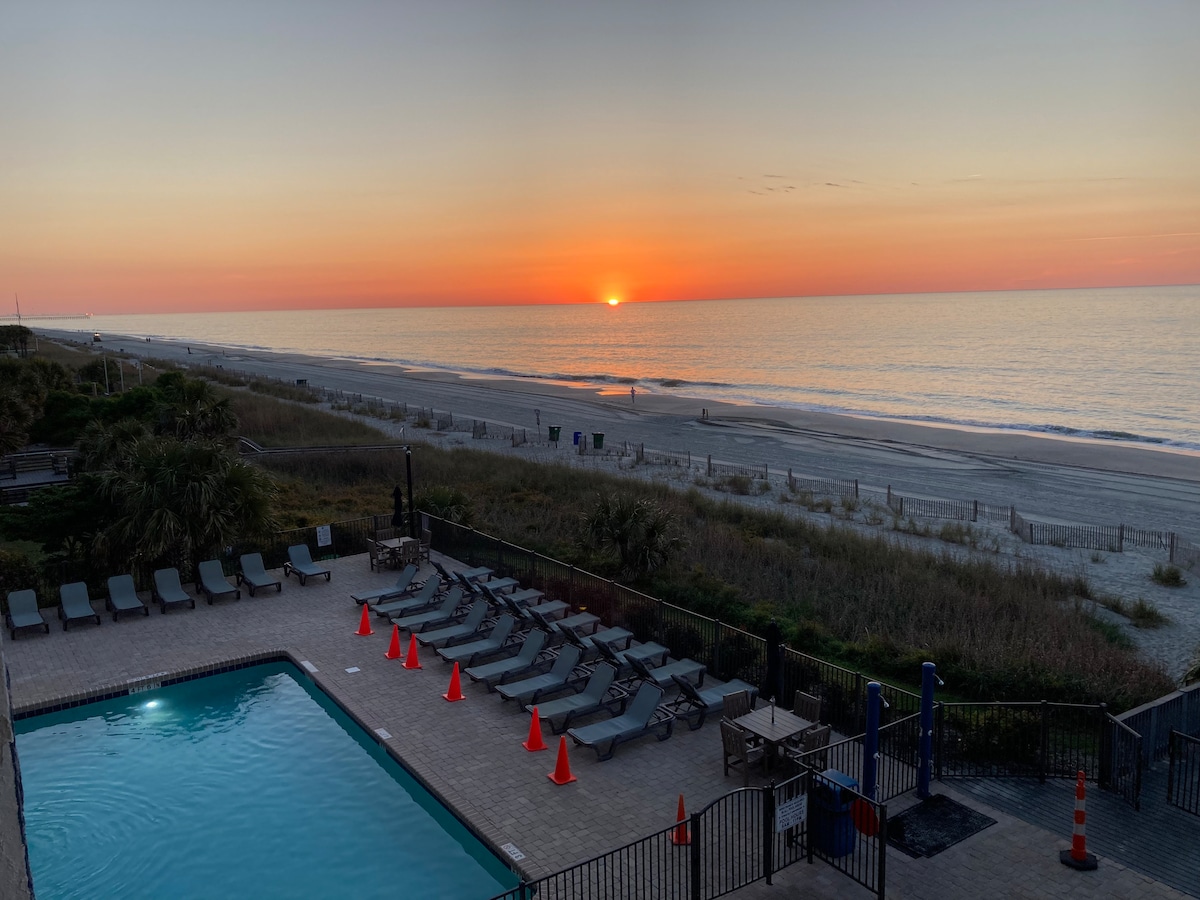 Beautiful King 1BR/1 bath DIRECT oceanfront condo. Lounge on your private balcony and watch the sunrise while sipping your morning coffee! 😊 Fireworks from the balcony every Wednesday evening during peak season! If you want a fabulous experience with your stay in Myrtle Beach, then please read my reviews and feel confident that you made the right choice. This is a direct oceanfront view, not a partial view! Minimum rental age-25. This 3rd floor oceanfront condo has all the comforts of home!