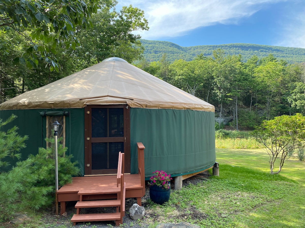 The 30’ yurt on the southeast edge of the Catskills, has served as an art studio, retaining a calm feeling of relaxation and creative energy. The circular space is simple and comfortable. Large windows and private deck look out onto a gentle incline leading to a scenic pond. You may be awakened by songbirds, the sighting of a heron, hummingbird, or deer. The sounds of peepers or gulping frogs and general sounds of nature at night begin as the sun sets over the mountain. Enjoy!