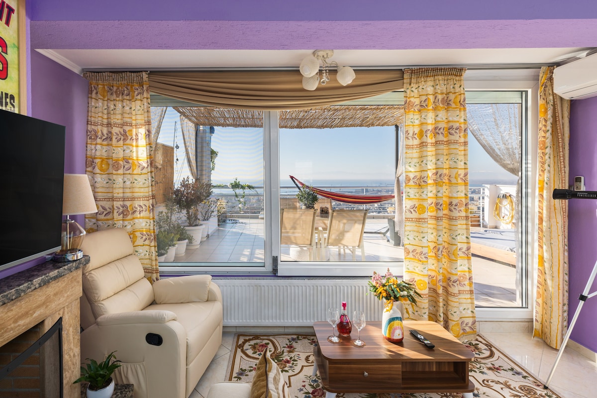 Unique 1 Bedroom fully equipped apartment on the seventh floor of a 2020 renovated building with a breathtaking terrace balcony. High speed internet, premium amenities, a luxurious queen size bed, and your very own Netflix account are but a few things we offer you. Luminous, spacious, with everything you might require to enjoy your stay in the heart of Thessaloniki's social life, only 5 minutes away from Aristotelous square and 2 minutes from the seafront. Welcome and enjoy your stay!