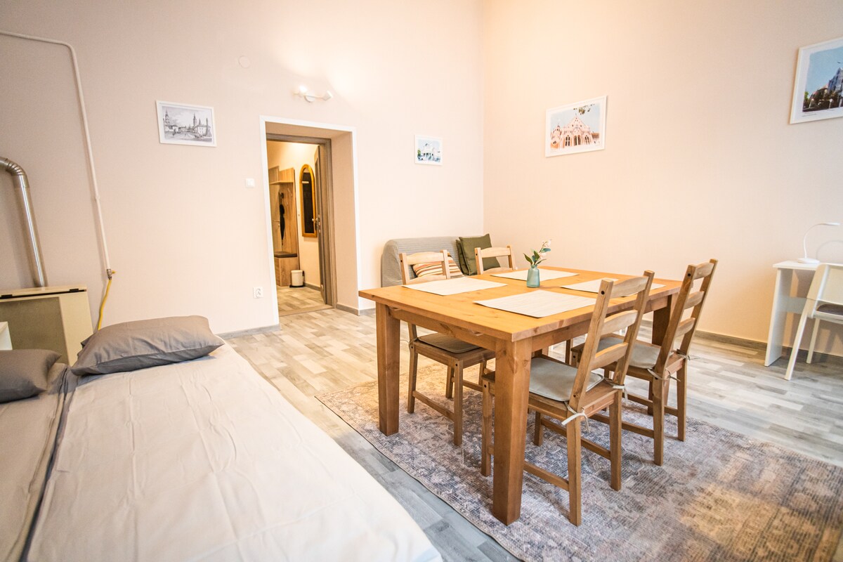 A little gem in the heart of the city, close to everything and yet quiet. The studio apartment has a gallery for sleeping and storage. Downstairs in one space you will find everything you need for comfort. TV, sofa, wardrobe, etc. The sofa downstairs can also be opened, the property is fully equipped. Restaurants, beach, Tisza bank, theater, nightclubs are within easy reach or a 10-15 minute walk.