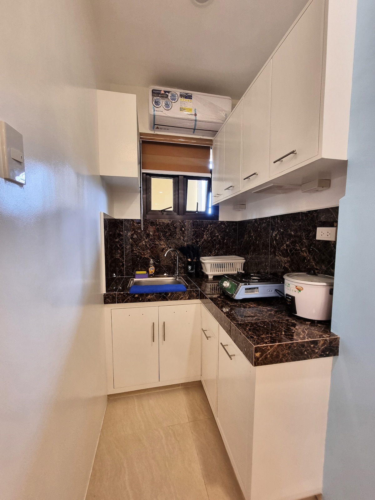 Clean and relaxing room. The location is 1 km from the City of Tabaco. The unit is located on the 2nd floor with a size of 722x274 cm and has a queen-size bed and pull out bed and comfortable mattress. The unit has its own comfort room and small kitchen if you wish to cook. There are nearby sari-sari store and eatery where you can buy your foods.