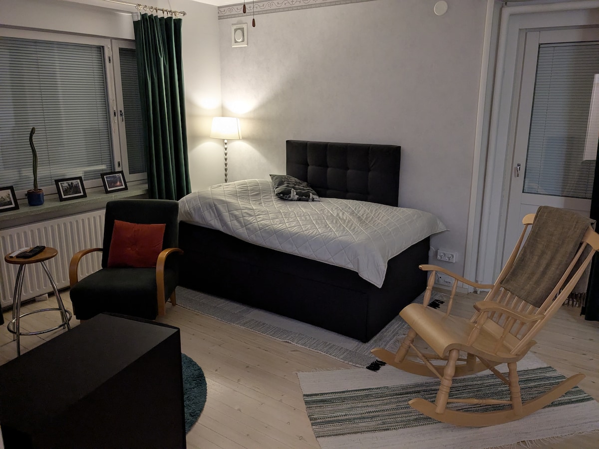 Welcome to a warm, atmospheric apartment as part of an old log building. The house is located in the Far East, under the paper mill pipes. The apartment is small, but compact and has everything you need. The car is free in the yard and the bus runs right next door. The neighborhood is nice and peaceful. Warmly welcome. Warm cozy studio with two single beds, lovely kitchen and bathroom with shower. In a location that is a short drive from the beautiful town and harbour of Lappeenranta.
