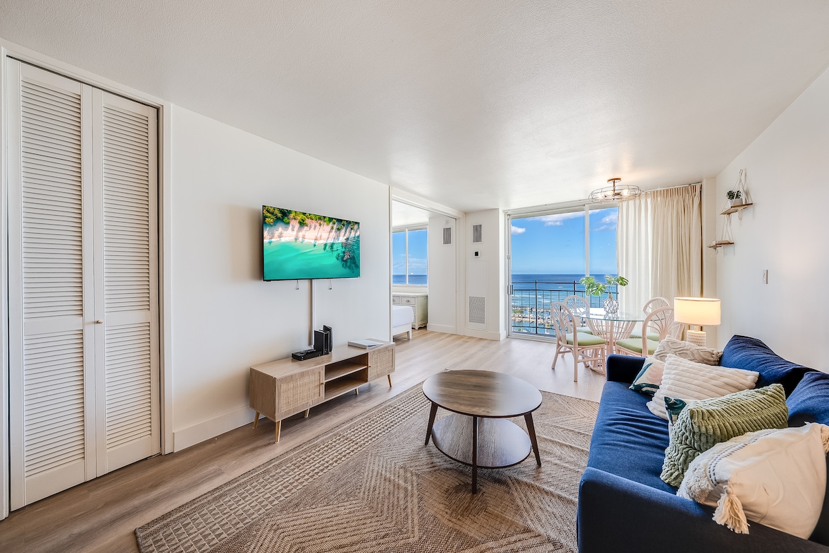 Renovated 1 bedroom/1 bathroom top floor apt in Waikiki. Beautiful 180 unobstructed panoramic ocean views from the Juliet balcony. See the Friday night fireworks and the sunset from the top! Queen size bed in bedroom. Bathroom has double sink, glass walk-in shower. Fully stocked kitchen. 24/7 security on site. Central A/C, Cable, WiFi included. Garage parking available for $35 a day. Five minute walk to Waikiki beach, Hilton hotel, Duke lagoon, and Ala Moana mall