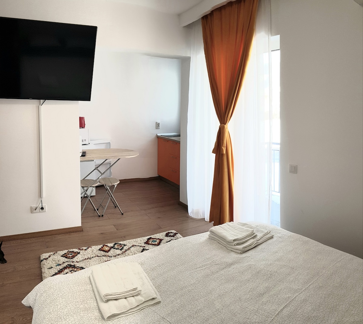 The apartment is equipped with a flat-screen TV, private bathroom, bed linen and towels, wardrobe. Kitchenette equipped with all cooking essentials, microwave, coffee machine with coffee and sugar, electric stove, toaster and fridge. Forget your worries in this spacious and quiet home.