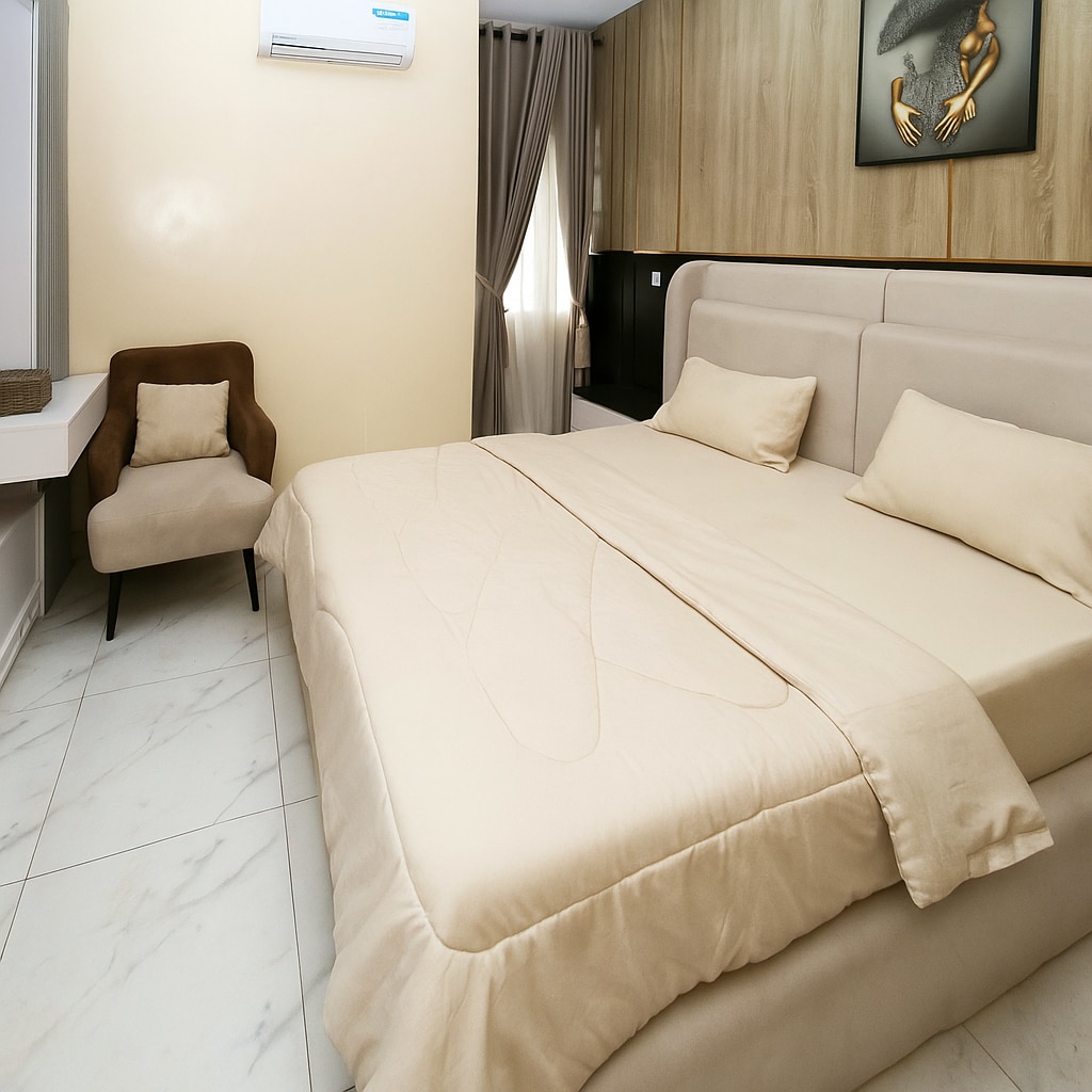 Escape to comfort in this stylish 4-bedrooms, 4.5-bath apartment in Oniru Estate, Victoria Island, Lagos. Enjoy a spacious living room with soft sofa, AC, Wi-Fi, Smart TV with Netflix, and a cozy dining area. The fully equipped kitchen has everything for home-cooked meals. Each ensuite bedroom offers comfort and privacy. Perfect for families, business travelers, or groups seeking luxury, convenience, and 24/7 security in one of Lagos’s most sought-after neighborhoods.