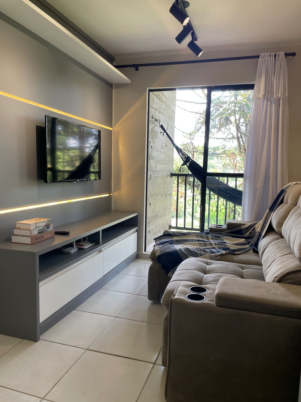 Modern and equipped apartment with stunning views, especially for the sunset. Excellent location, close to pharmacies, gym, UPA, bakery and fruit shop. Parking included. The condominium offers market and pet space. We prioritise recycling, with specific bins. It has TV in the living room and bedroom, as well as a Nintendo for fun. The home office is well equipped, with an extra screen, mouse pad and gamer chair. In-room air conditioning (cold) and fans/heaters in the rooms.