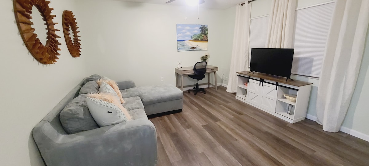 Enjoy a stylish experience at this 2 Bedroom Bungalow, nestled in Seminole Heights near hotspots and breweries, this foodie district is known for. With a quick 5 minute drive you can easily enjoy the day at Tampa's major attractions or a night on the town in Downtown Tampa or Ybor city. (Tampa's Historical district) This bungalow comes with a Full Kitchen, Laundry Room, Free Parking, & a Private Back Yard. Free Wifi with Netflix and Disney + Professionally Cleaned following CDC Guidelines