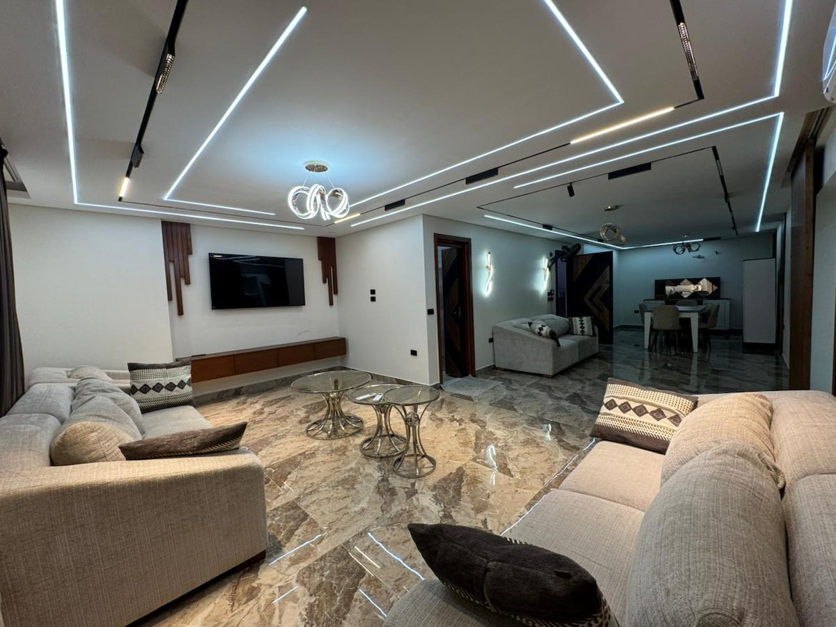 θ Description of the apartment: Luxury hotel experience with a luxurious home touch! Enjoy an exceptional stay in a stylish, carefully crafted apartment that combines contemporary comfort and refinement, offering you a tranquil atmosphere to relax after a day of activity. Living 🛋️ room: Featuring a modern design and spacious space featuring a comfortable seating area and a PS4 entertainment device, with a smart TV and high-speed internet access for an integrated entertainment experience. 🍸 Kitchen: Open to the living room in an elegant style, with luxurious bar chairs that add a refined aesthetic.