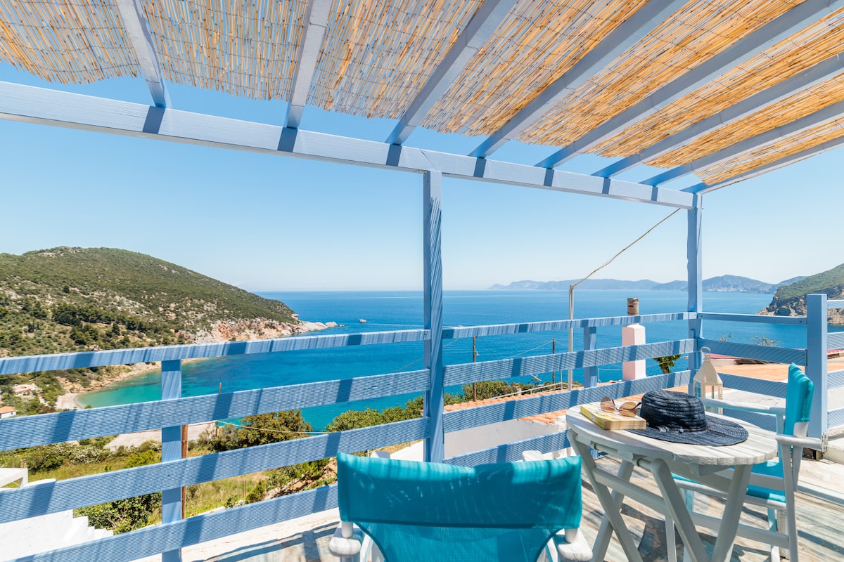 * New mattresses 2025! * Renovated old stone two-level house in a plot with astonishing view to aegean sea located in the highest part of the traditional village Zagora. Great choice for families, group of friends or couples seeking peacefulness and comfort for their vacation; either summer or winter.