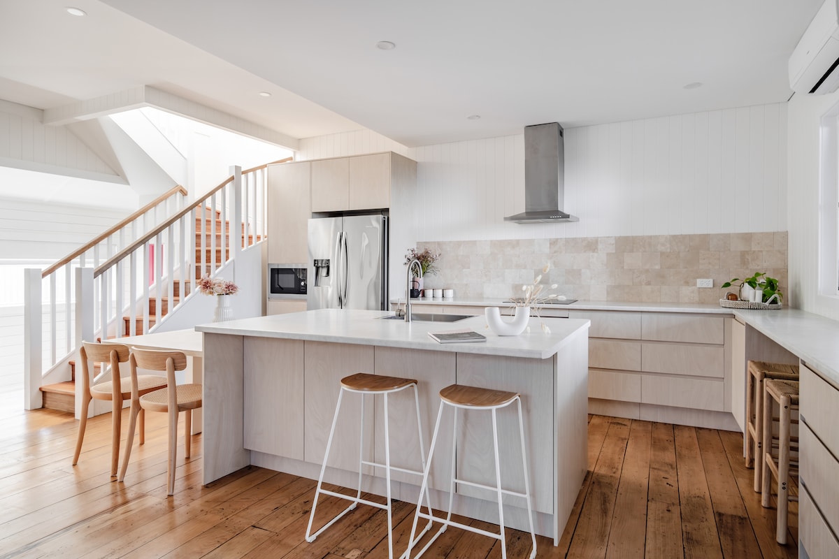A large charming renovated two story terrace full of character and homely comforts. Large sun filled decks have been built to make the most of the beautiful ocean views creating a relaxed space for family and friends to enjoy. Walk 2 mins to the end of the street and you’ll be at the Scarborough hotel where you can have a drink, coffee, a casual lunch or dinner surrounded by incredible views of the ocean!