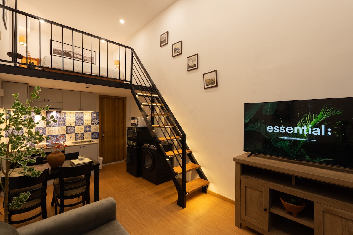 Fall in love with our Japanese-inspired studio in downtown Saigon! The stunning space features exposed columns, curved walls and a unique glass ceiling that fills the hallway with sunlight. Relax at the small garden and coffee lounge at the back. The unit is equipped with a luxurious bed, full kitchen, Netflix, toilet with bidet, and bath essentials—all the ingredients for a perfect stay ;)