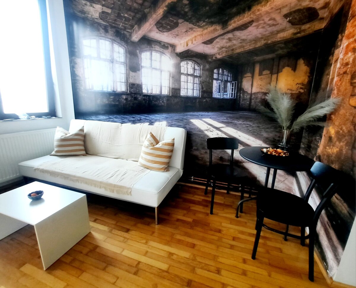 Acest studio a fost gândit astfel încât să surprindă conceptul de modern, dar totodată să fie cozy si primitor pentru oaspeții săi. Camera principală a fost compartimentată pentru a putea avea un spațiu separat pentru dormitor un living cozy și o bucătărie utilată cu tot ceea ce este necesar. Zona în care este amplasat blocul este o zonă exclusivistă, liniștită, apartamentul făcând parte dintr-un complex nou și modern, recent construit. De asemenea, există și un loc de parcare oferit clienților.