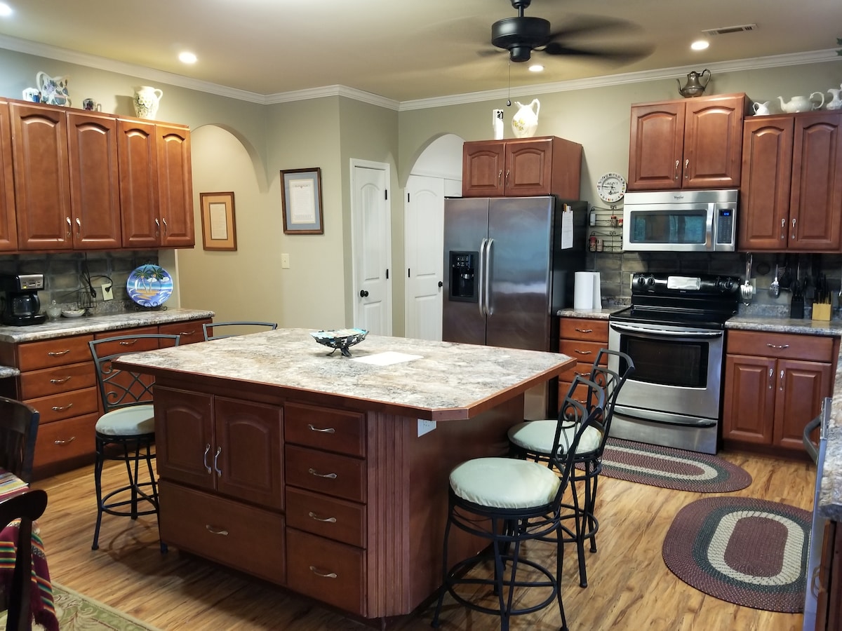 Beautiful "cabin" located just 1.7 miles from the state line boat ramp. This 5 bedroom, 3.5 bath home is located on 1.4 acres at the end of a short street with ample parking for both cars and boat trailers. It sleeps 13 in beds, 15 with use of couches . Large open kitchen and living area for all those family game nights. This is our lake house that we use frequently but we have decided to open it up for others to enjoy when we are not lucky enough to be there.