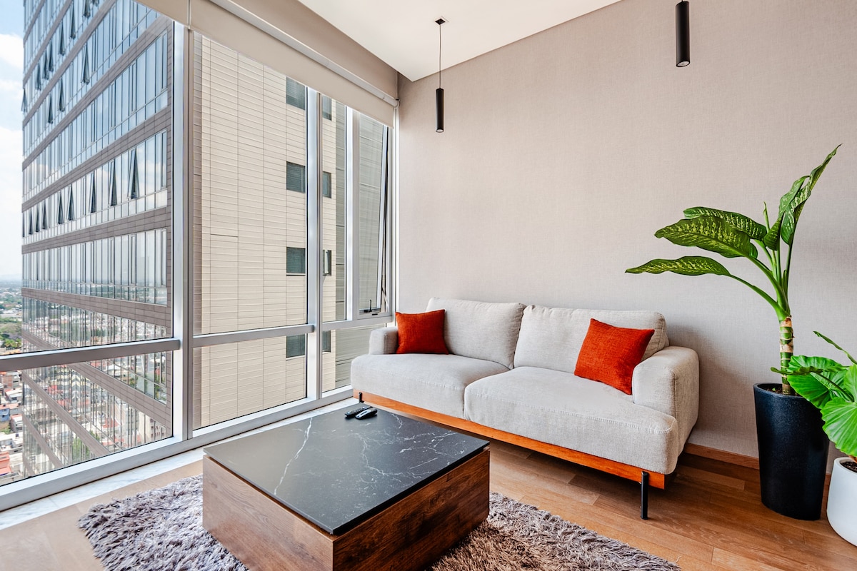 Kick back and relax in this calm, stylish space. Designed to make your stay as pleasant as possible. Enjoy watching movies on the 85-inch screen while comfortably seated on the sofa or rest in the room. We have a fully-equipped kitchen and a balcony. The apartment's view is very nice during the day and spectacular at night. The building is located in front of the Gran Sur shopping center, very close to the Aztec stadium and hospital area