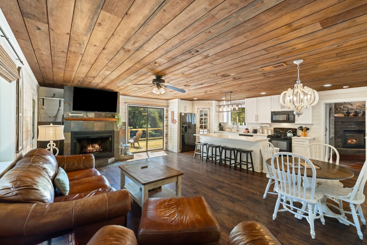 As Seen on "Trips to Discover"! Cozy, modern & rustic cabin in the Aska Adventure area across the street from the Toccoa River. Swing on the porch or enjoy the outside fire pit while listening to the river. Cook a meal in the open kitchen, dine at 2 eateries within walking distance or travel to Blue Ridge or Ellijay and visit the many great restaurants. Tubing, kayaking, gem mining are next door. This cabin is on a paved road and only 10 minutes from town. Fannin County STVR #1599.