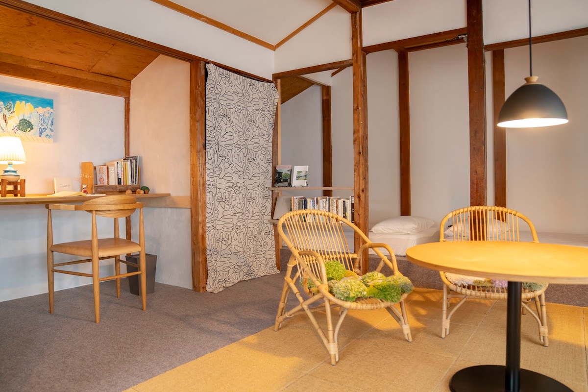 This is a private inn that has been remodeled from an old house with DIY. Located on the edge of a leafy village, you can enjoy extraordinary experiences such as the owner's special interiors, wine barrel baths and long-lasting sofas. On the same site is a thatched house where the owner lives. You might relax in a nostalgic, modern space that uses an old-fashioned box staircase. This property can be used for families, groups (max 6 person). Of course, 1 person or 2 people also welcome.