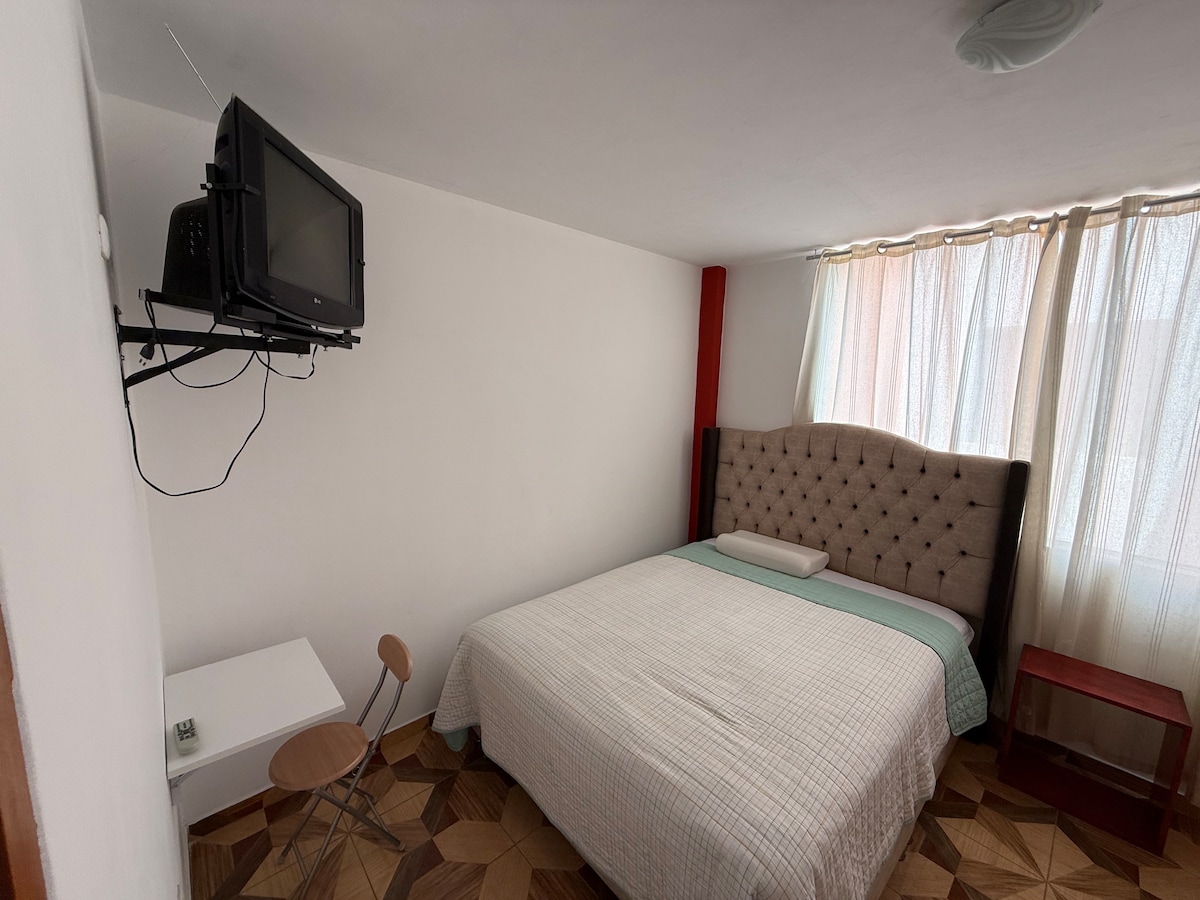 Habitación luminosa con cama matrimonial súper cómoda. Disfruta de su ambiente moderno y limpio, con Tv, un armario, mucha luz y un baño propio con ducha.