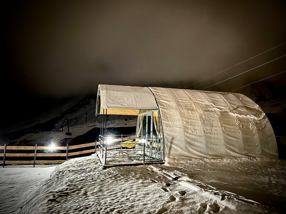 describtion Gabua Wooden Glamping is located in Gergeti village, Kazbegi Municipality, our Glamping has bedroom, private bathroom, kitchen, terrace, which has outdoor furniture, outdoor pool, free wifi and much more in the fairytale mountains. Stepantsminda center is 1.6 km from our accomodation. From our Glamping is hiking path to Sameba Trinity Church. There are two nearest airports, the first is Tbilisi International airport and the second is Vladikavkaz International airport.