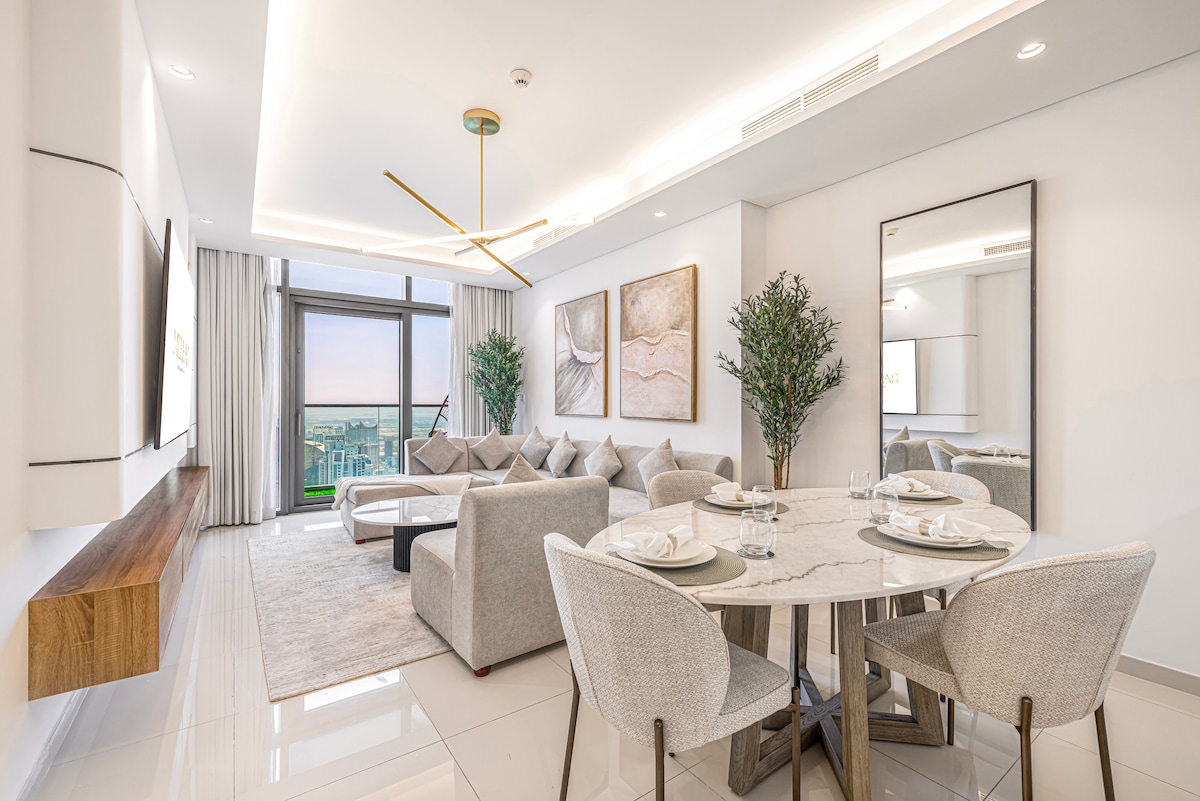 Experience luxury at our exclusive, fully serviced apartment nestled within a 5-star hotel. Enjoy the breathtaking views of the iconic Burj Khalifa from the largest infinity pool on the 64th floor, maintain your fitness regime in our state-of-the-art gym with panoramic city views, and immerse yourself in our stylish apartment, complemented by a stunning Downtown and Sea view from our 33rd floor balcony and a fully equipped kitchen.