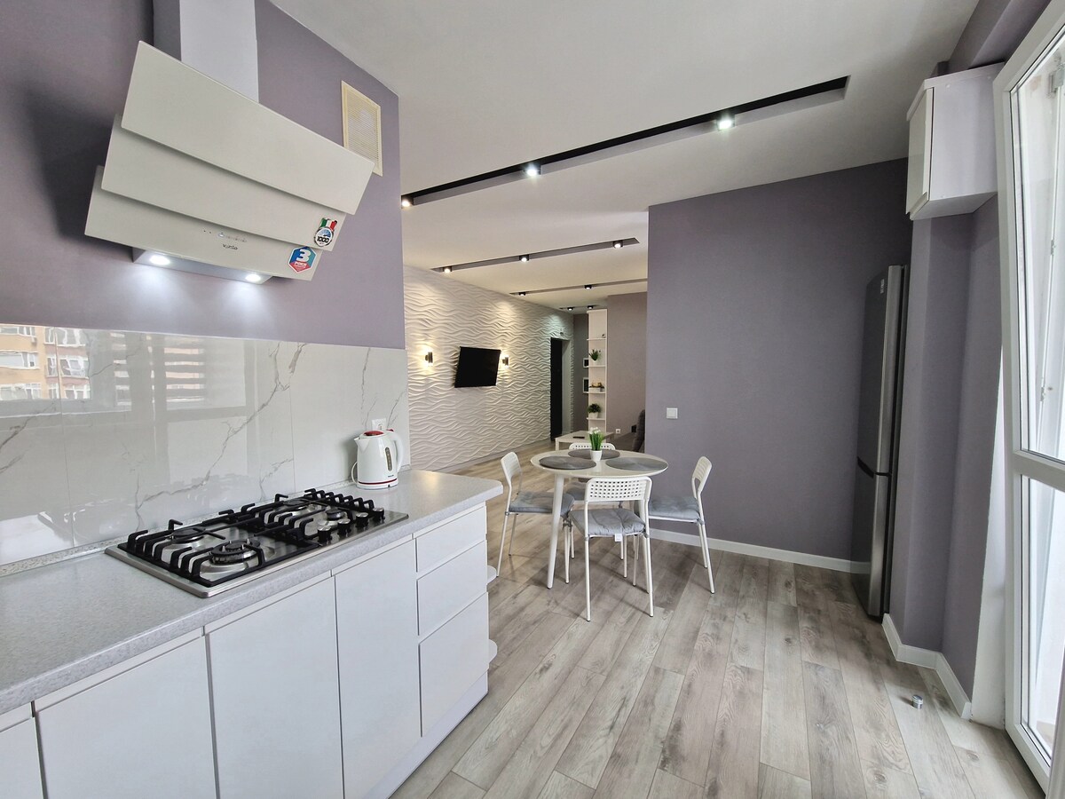 An apartment with designer European-style renovation, a house with a closed area under 24-hour security, near the city lake and park, 5 minutes by car to the center. Next to the apartment there is a developed infrastructure - a supermarket, many small shops, pharmacies and cafes. The apartment has everything you need for living - a large kitchen, bathroom, toilet, hairdryer, fridge, washing machine, microwave, electric kettle, stove, dishes, 2x bed with orthopedic mattress, folding 2x sofa bed, towels, Wi-Fi, warm floor.