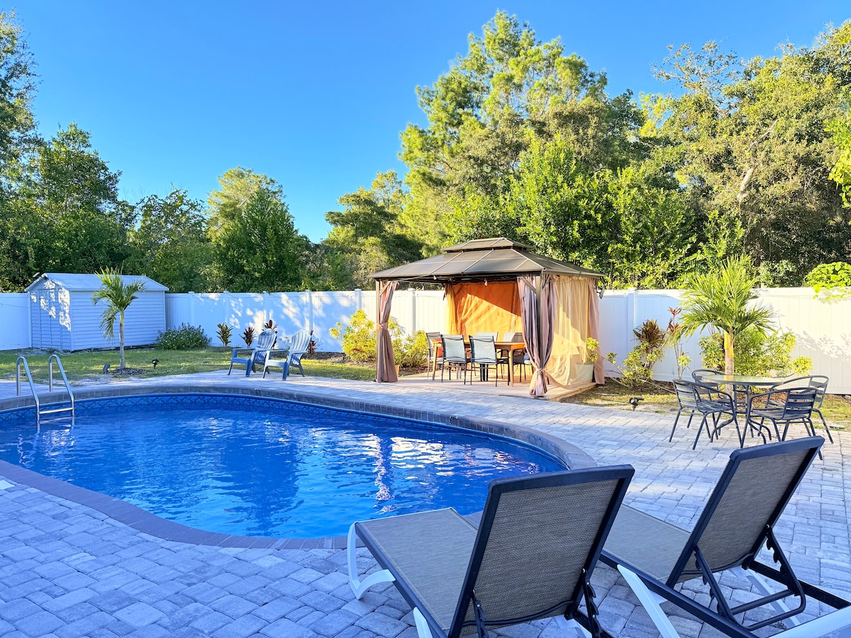 Welcome to your ultimate getaway! This stunning vacation home offers a perfect blend of modern luxury and tropical paradise, all in one exceptional property. Relax by the palm trees, private pool, jacuzzi, outdoor cabana and make delicious meals with our new Weber grill. This family-friendly vacation home was perfectly designed for unforgettable getaways. This property offers both excitement and relaxation in one incredible package. 8 minutes to Universal, 15 min to Disney and 23 min to MCO.