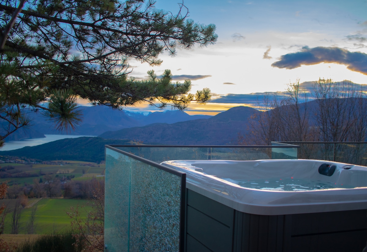 Joli T3 au rez de jardin de la Maison du Bonheur. Grande terrasse avec salon de jardin, jacuzzi, barbecue. Propriété clôturée et fermée. Vue imprenable sur le lac et les montagnes, à deux pas d'un rocher d'escalade, de la forêt et de nombreuses balades. La Maison paisible et authentique, vous accueille dans une ambiance douce, épurée et chaleureuse. Ici, simplicité rime avec sérénité...La décoration, soigneusement pensée, mêle matériaux naturels, teintes douces et objets choisis avec le cœur.
