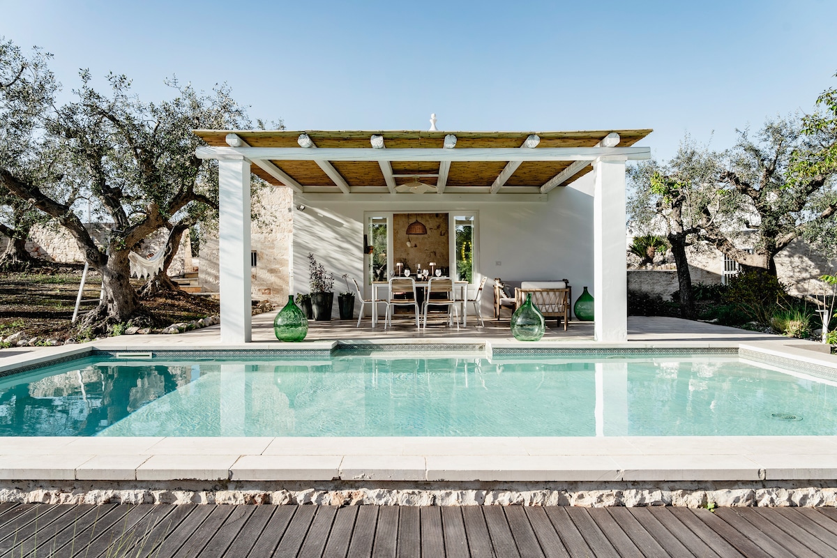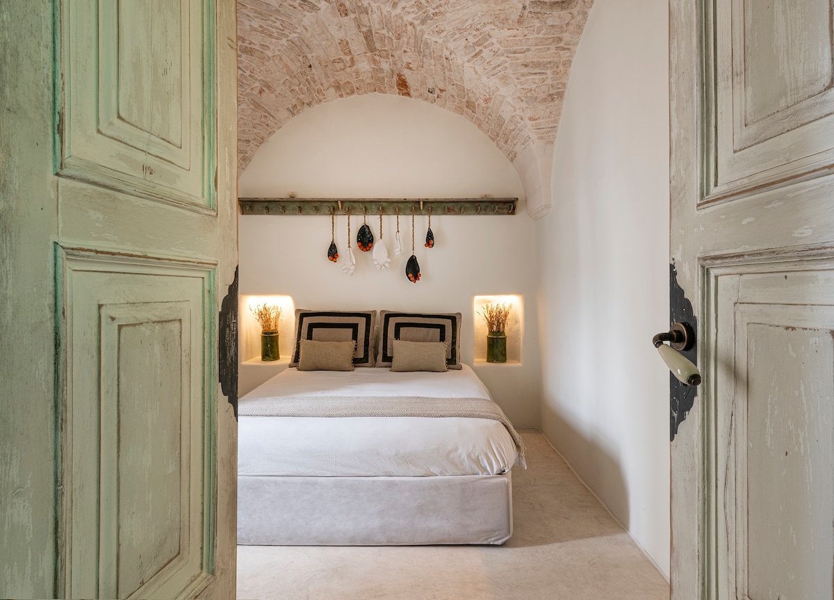 This unique space, carved inside traditional trulli, has its own charm and lets you experience the true spirit of the Itria Valley. You enter through an old strawberry‑grape pergola. The kitchen and bathroom are set in the alcoves, while the dining and sleeping areas are located in a saracen trullo and a tall‑cone trullo. The private patio and nearby infinity‑edge pool offer views of the valley and the skyline of Ceglie Messapica.