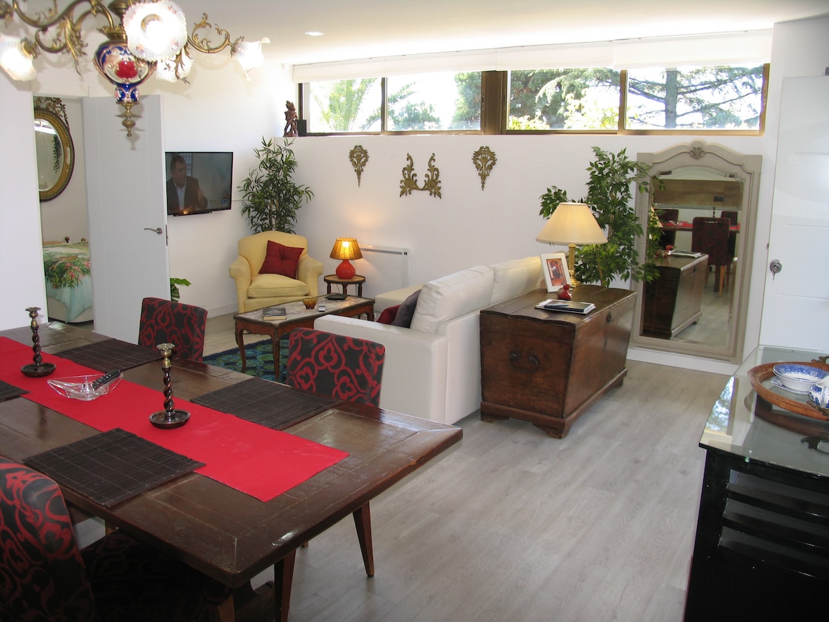 Independent fully equipped 30sqm house + 25sqm private sunny patio with outdoor dining area and jasmine clad walls. A newly renovated double bedroom, bathroom, living and dining room, open plan kitchen, it is an oasis away from Madrid's bustle! When in season,our solar pool can be used occasionally upon prior agreement. 10 min walk to Metro, urban rail and busses. 2 min walk to restaurants. Shopping mall and all amenities nearby. Free parking . Next to Montecarmelo, Las Tablas and Alcobendas.