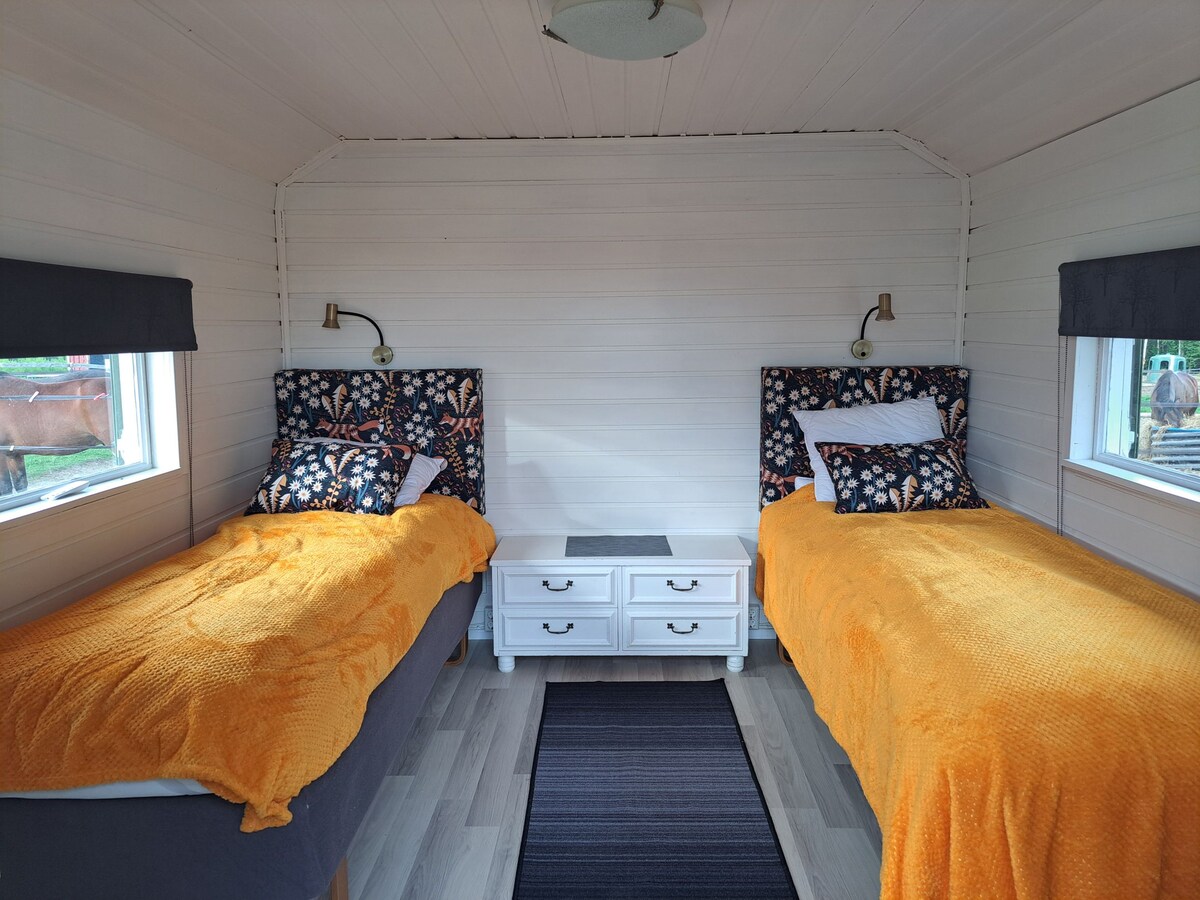 Smaller cottage only 15 meters to the river! Good sunny location! Fully-equipped kitchen. Shower, toilet and washer/dryer. 48" TV with Chromecast. 160 cm double bed. 140 sofa bed. Wood-fired sauna & hot tub available, SEK 750/4h hot tub, SEK 750/4h sauna. Bed linens/towels rent for SEK 150 per person. Hot tub is not guaranteed when booking is made less than 5 days before. (cleaning, chemicals and chlorine) Enjoy the views, nice walking trails, close to downtown, nature reserve, Ica Maxi & Avion.