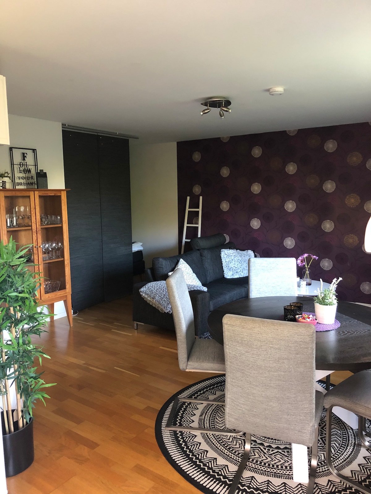 Stay in this cozy apartment with proximity to beautiful nature. The area is a quiet, newly built residential neighborhood. Bus stop is 2 minutes by foot from the apartment. Bus to the city center takes 17 minutes, the arena city 12 minutes. Departures every 20 minutes. Free parking at the apartment. There is a 120 cm bed and a 90 cm bunk bed. The sofa in the living room is 90 cm wide and 175 cm long. There is no window in the bedroom. The stairs are steep, but walkable. The apartment is in a garage building.