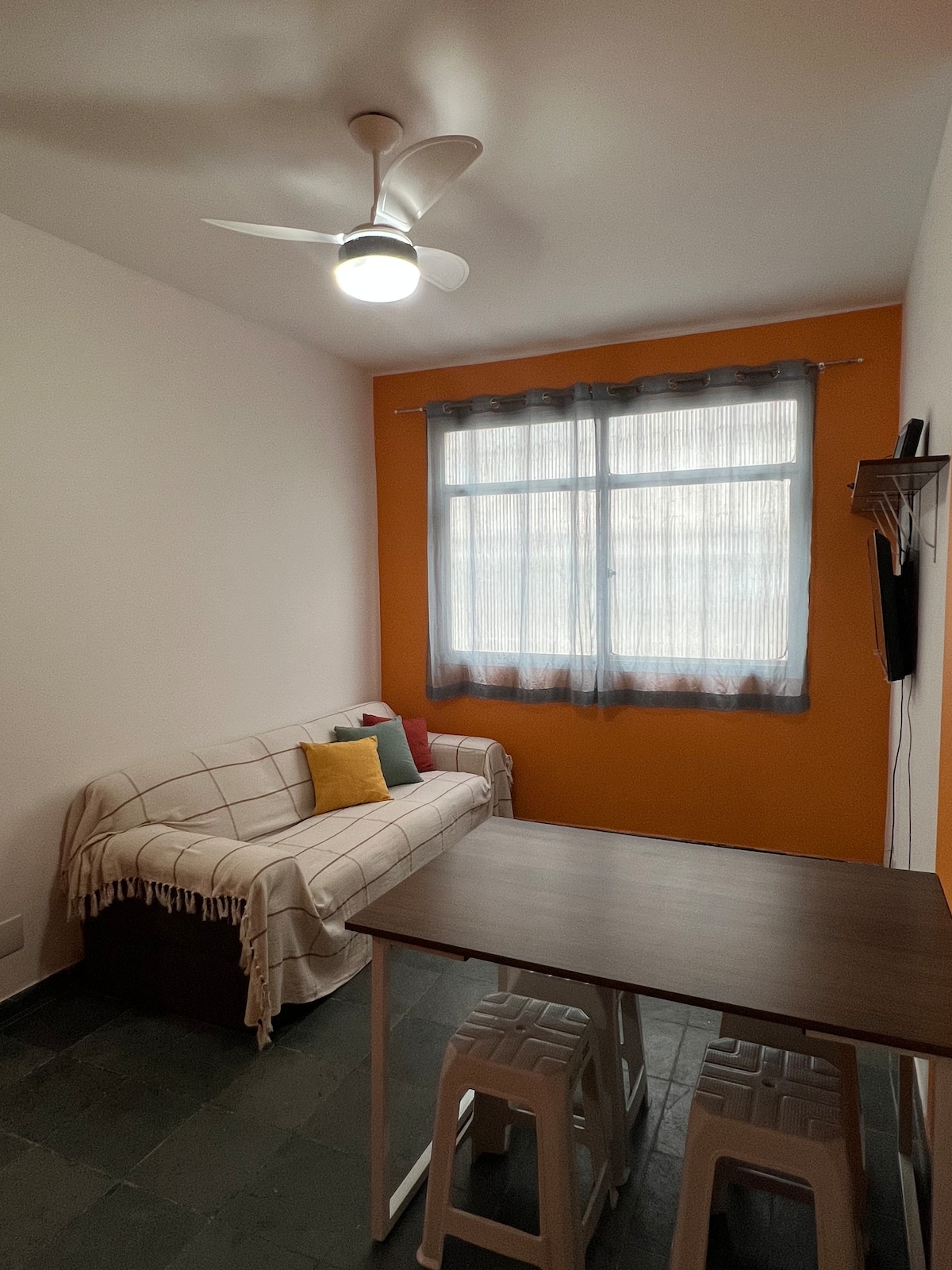 odern and well-designed apartment: Studio layout Living room with 50" Smart TV integrated with a fully equipped kitchen Strategic location: Centrally located, less than 200 meters from supermarkets, pharmacies, shopping malls, bars, and restaurants. Everything you need, just a short walk from home!