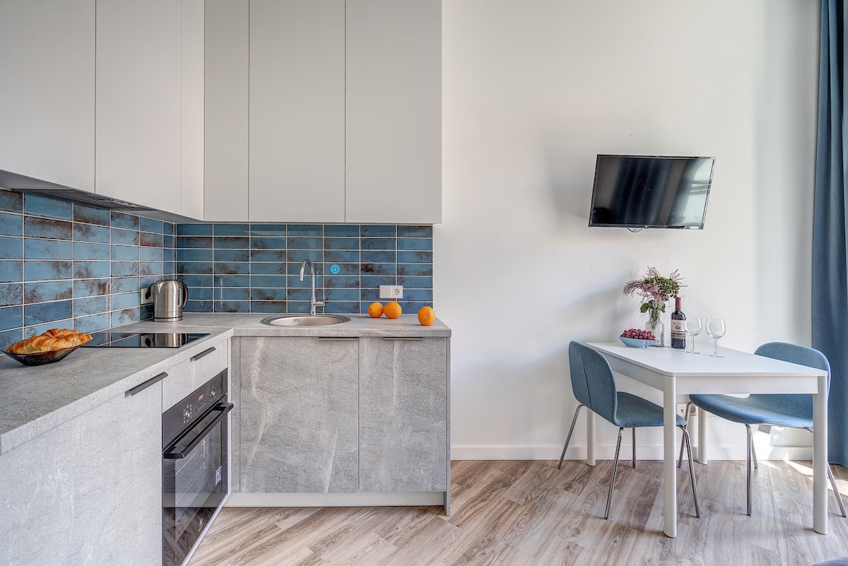 Modern design, On the top 24th floor of a famous skyscraper . Large windows offer amazing views of the city and beyond . The apartment has a lot of facilities,a big bathroom with a massaging jacuzzi, and a high quality home theater system with OLED tv and 12 speakers around. It’s located above a shopping mall, with the Old Town on one side and the new business district on the other, both within walking distance. Perfect for couples, business travelers, and families.