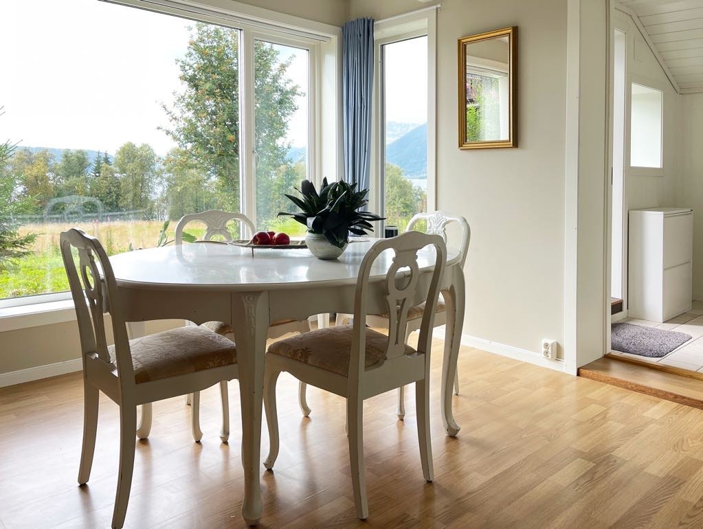 Sengeplass 2 voksne, 1 barn i reiseseng. Mulighet for en ekstra voksen på madrass. Gi beskjed ifb med bestilling. Praktfull beliggenhet ved Totakvannet. Her kan dere nyte ro og stillhet. Høy standard. Naturen kommer inn i stuen. Rådyr, harer, rev og hjort kommer ofte forbi. Yrende fulgleliv. Tranene har landingsplass her på vei inn til sine hekkeområder. Middelalder «prestvegen» går forbi eiendommen og kan følges gjennom skogen til Sandane som er badestranden med stor B. Sol fra midt på dagen.
