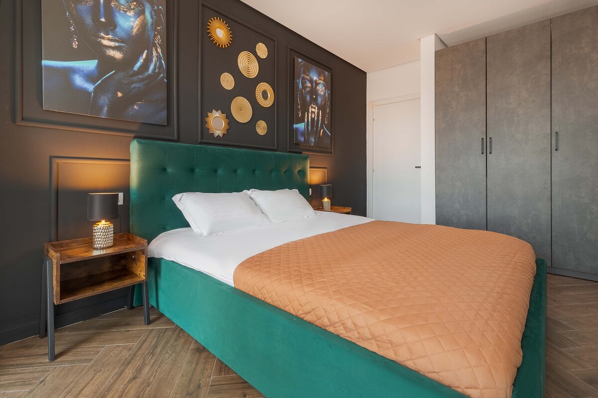 Experience luxury in this stunning apartment, adorned with dark tones, black colors, and elegant gold accents. The open-space living room features a cozy sofa for 2 adults, perfect for relaxation. Enjoy a fully equipped kitchen and a king-size bedroom with a stylish bathroom boasting a walk-in shower. Step out onto your private balcony for breathtaking city views. With reserved parking and easy access to the city center, just a short walk or a 5-min drive away, this is the ideal urban retreat.