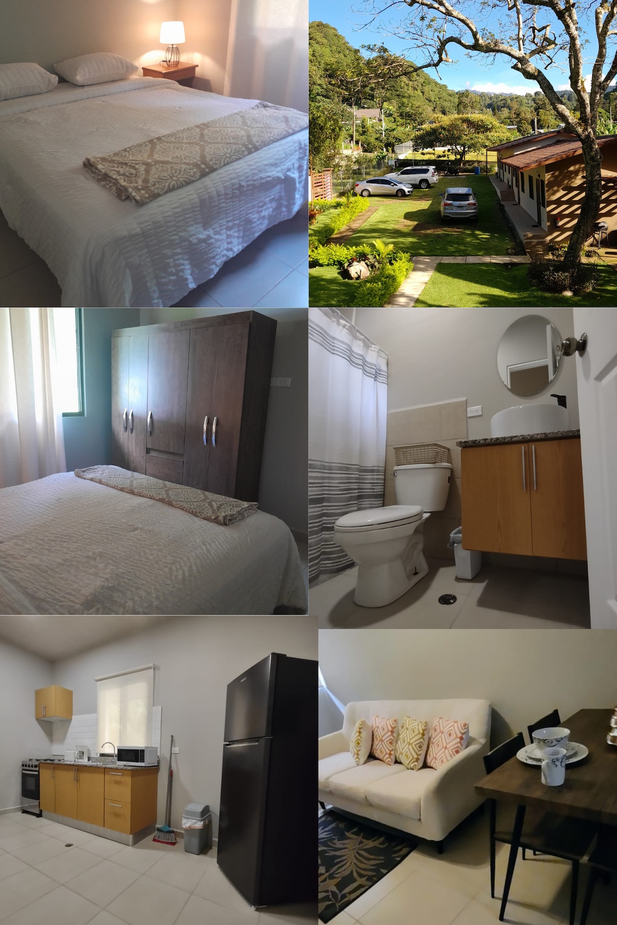 Una cabaña pequeña con vista a las montañas para compartir con quienes más quieres 🏡⛰️. Sin lujos, pero con todo lo necesario para descansar, compartir y sentirse como en casa✨ Ofrecemos: •Ubicación: 6 minutos en carro del Centro de Boquete 🚗 • 2 habitaciones con camas tamaño full • 1 cama tamaño queen en la sala #2 (área abierta) •Estacionamiento al aire libre •1 Baño en planta baja •Cocina equipada •TV de 65” •Wi-Fi •Trampolín para los niños •Terraza con BBQ a gas y leña •Amplio Jardín