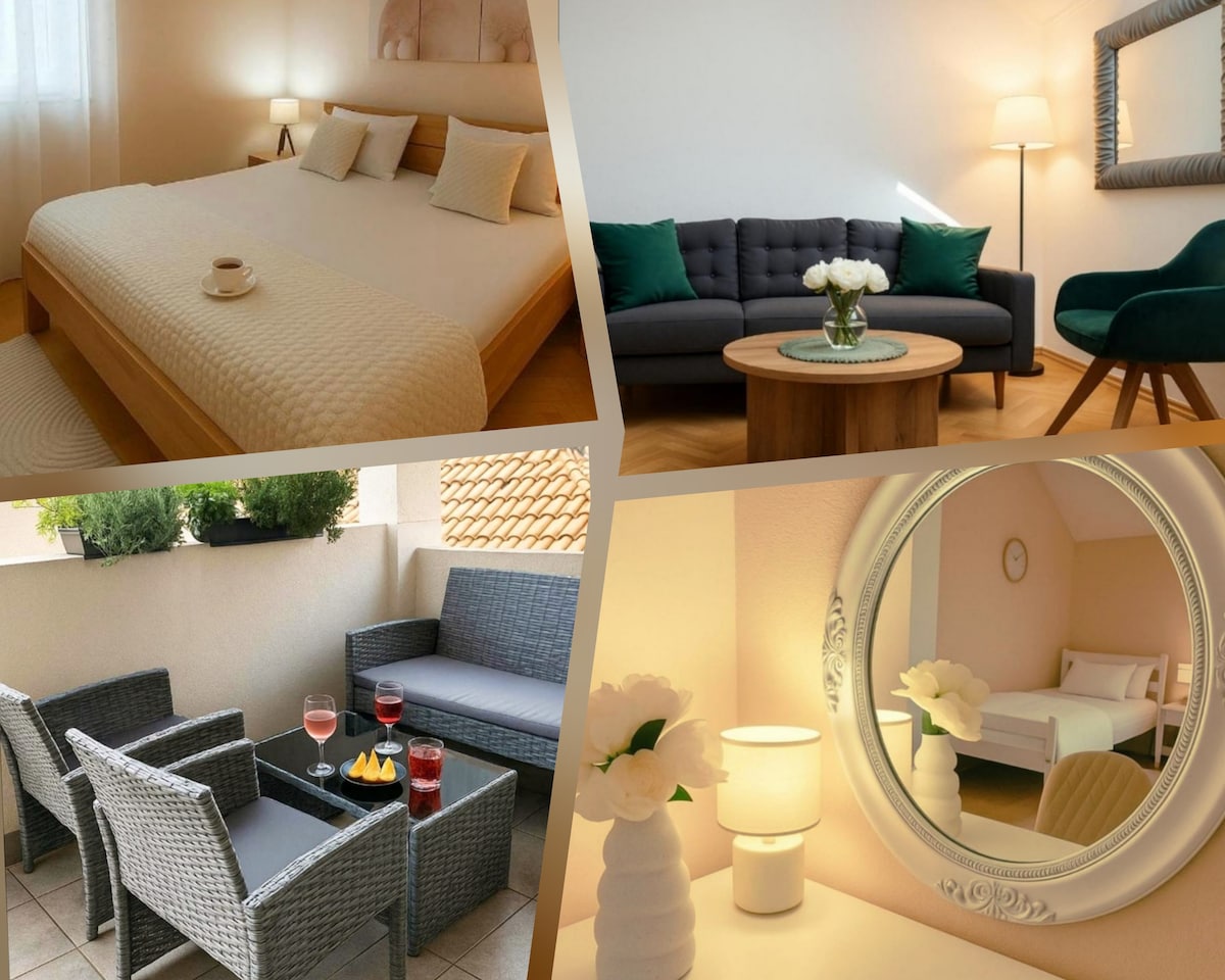 Enjoy a stylish experience at this centrally-located place in brand new building.The apartment consists of a bright bedroom with a comfy king-sized bed, dinning table for 4 persons and modern fully equipped kitchen. A sunlit living room with Smart TV. The pull-out corner in the living room can also serve as an additional bed for 2 more guests. The entire apartment was designed by architect (Adil Glavovic - axisarchiteture)