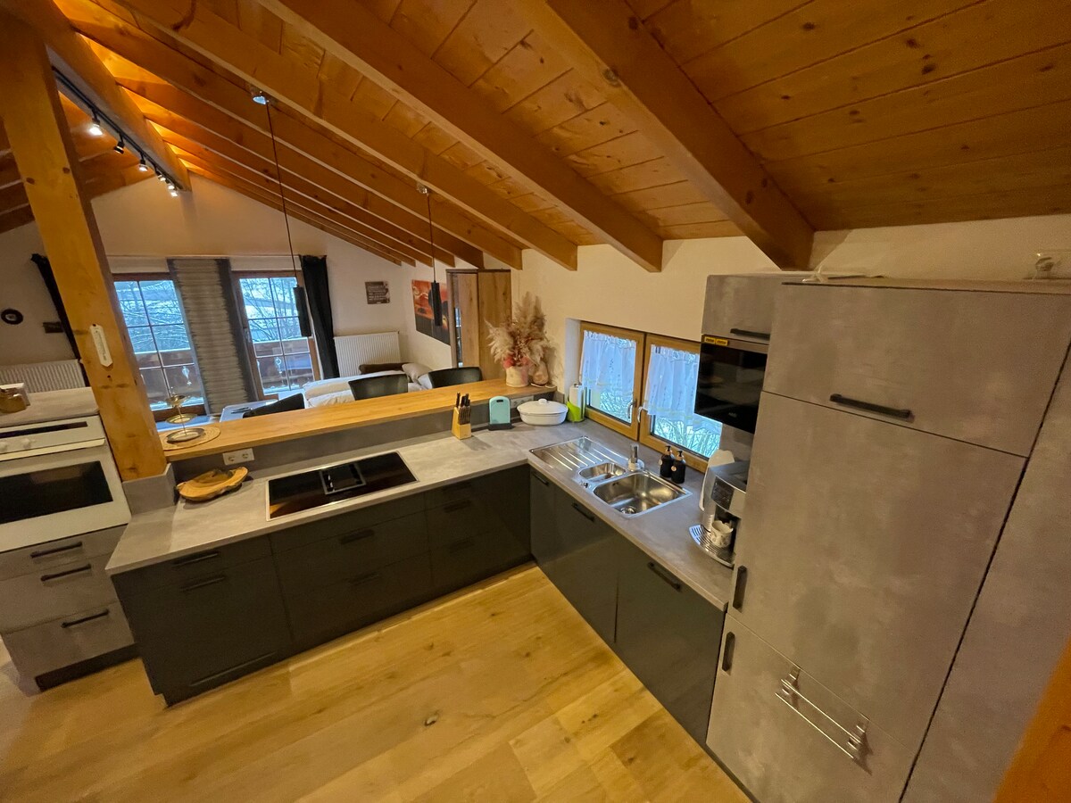 ✨ Auszeit im Grünen Stilvolle, helle Dachwohnung mit eigener kleiner Loggia – ideal für Paare (und kleine Familien) , die Ruhe und Komfort lieben. 🌿 Wohnen & Wohlfühlen ✮ Kleine Loggia mit Wiesenblick für Frühstück + Sundowner. ✮ Wohnraum mit Sofa, Esstisch, Klimagerät, Küchenzeile (Ceran, Mikrowelle mit Grill/Heißluft, Kühlschrank mit Gefrierfach, Carbonator, Nespresso etc.). ✮ Schlafzimmer mit Doppelbett, Einbauschrank und Sekretär. ✮ Bad mit Wanne, Duschwand, WC und großem Spiegel.