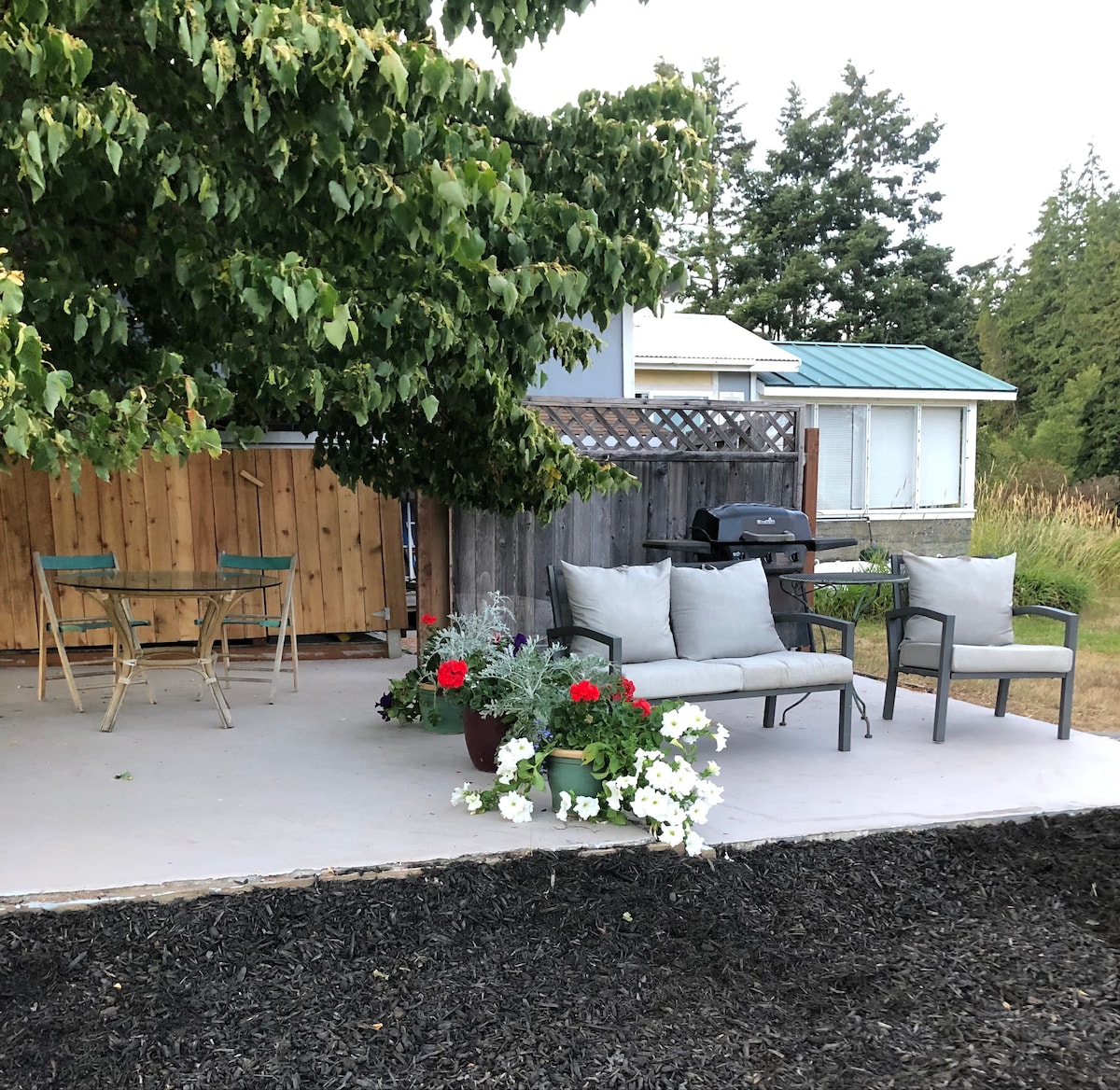 Comfortable one bedroom cottage with sun-room fully insulated and extremely wonderful . There is also a back patio with a great view overlooking the lower pasture and wetland. BBQ and comfortable outdoor furniture. On a hot day the patio offers good shade. It comfortably fits two and is centrally located. An easy 15 minute drive to most attractions. Dog friendly with pet fee (please reach out if you have questions).