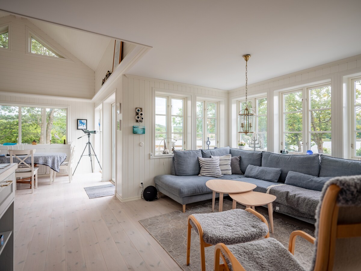Newly-built cottage right by the sea with a large jetty and a private berth. The dock is made for you to enjoy all day, as there are sun loungers, swimming ladder, outdoor furniture and barbecue. Within walking distance, you can rent kayaks, paddle tennis courts and a spa. The cottage has an open living room and kitchen with stunning views of the sea. Toilet with shower and washing machine. Upstairs, there are 3 bedrooms. One with a double bed and a private balcony, one with 2 single beds that can be put together and one with a 120 cm bed.