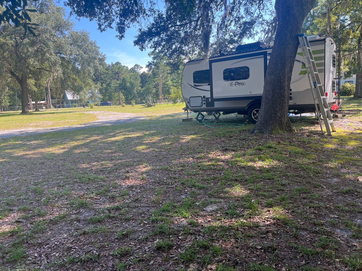The "Wheelhouse" glamping is a perfect getaway, for a retreat from the hustle of the busy tourist areas but still a short drive to the beach or bay. Get away from it all when you and enjoy yourself in the RV or the 40ft screened with a swing bed and porch bistro set. The unit has a queen size bed, bathroom with a stand up shower. Kitchen is fully stocked. This RV has a TV, cable and wifi. The living area has a full couch and heated recliners. We also provide bikes.