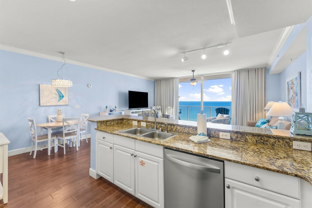 This 7th-floor corner unit condo at Tidewater Beach Resort offers breathtaking panoramic views of the endless shoreline of the emerald Gulf Coast. From the private balcony or the comfort of the living room sofa or dining table, enjoy stunning sunsets over the ocean and dazzling city lights at night. Resort boasts incredible amenities, including two lagoon-style pools, a heated indoor pool, hot tubs, a state-of-the-art fitness center with a Roman spa, a movie theater, and private beach access.