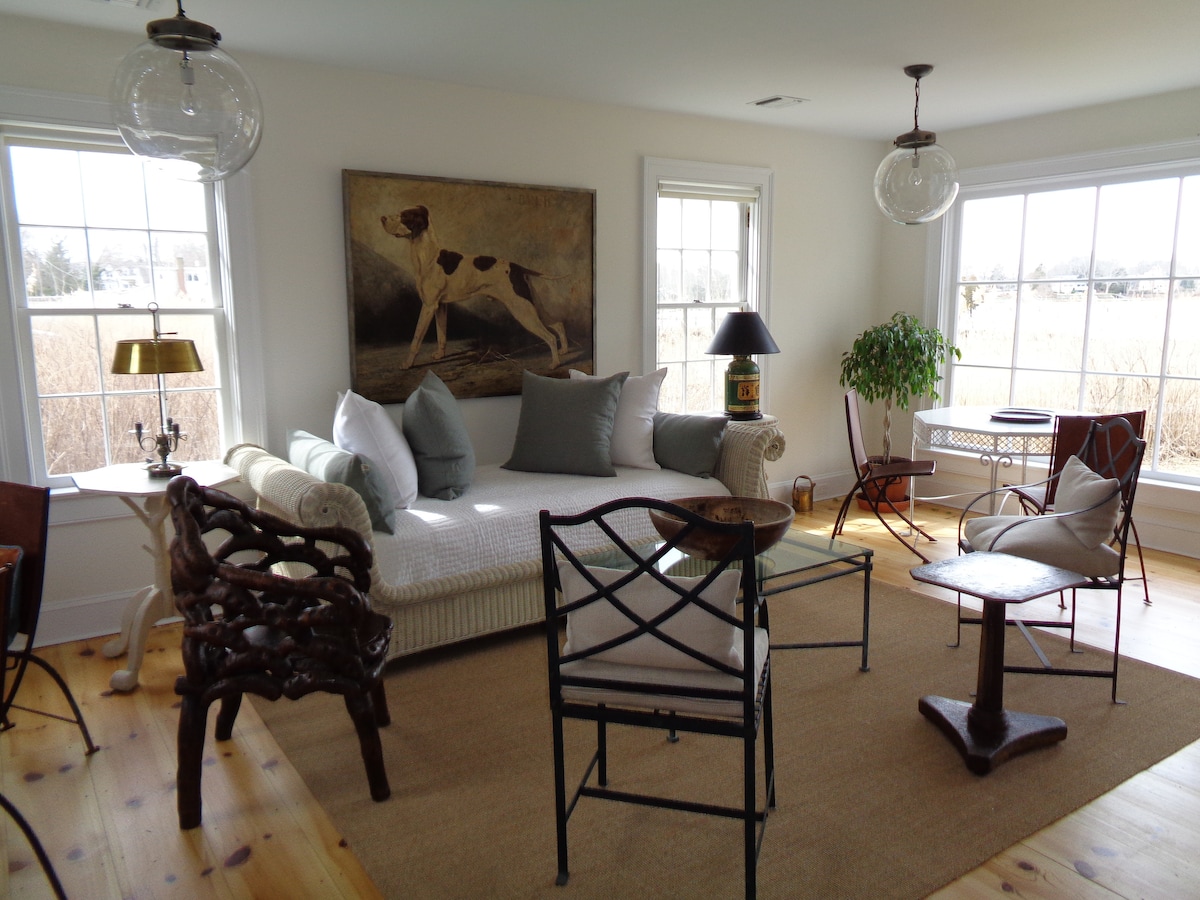 Whaling Captain Pierson's Cottage is at a waterfront property. A unique environmental experience, nestled in nature but only a 7 minutes’ walk from the center of historic Sag Harbor Village. It is the only cottage offering a vast, picturesque, panoramic view of beautiful Sag Harbor Cove from Main Street as well as spectacular sunsets and a private low-tide beach. (See my reviews from my other listings entitled, "Whaling Captain Pierson's Apartment" and "Whaling Captain Pierson's Apartment TOO".)