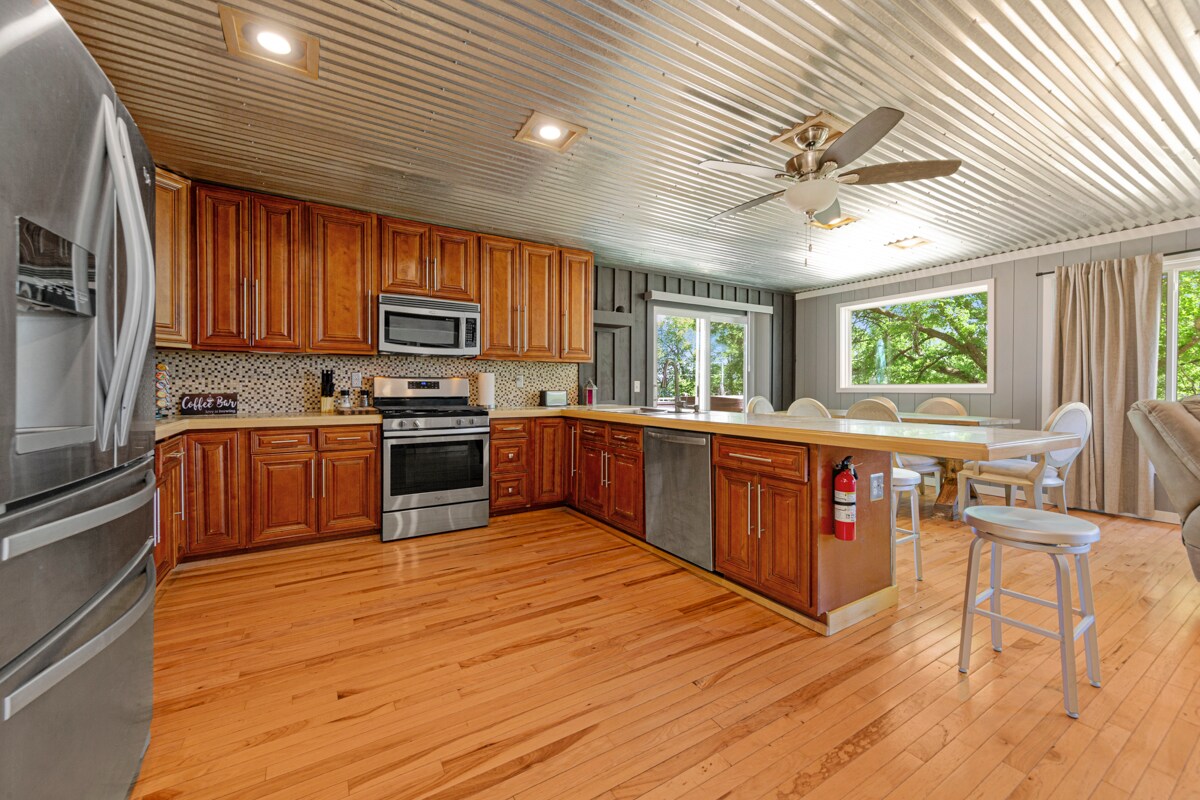 The Sunrise Retreat is perfect for those who want a private, off-the-beaten-path experience while still having access to nearby attractions and amenities. It is nestled directly on the lakeshore, offering unobstructed views of the water. It comes with its own private dock, a lakeside fire pit, and a deck, so guests can enjoy the peace of the lake in their own space. It features multiple bedrooms and a full kitchen with modern appliances, making it easy to prepare meals for the whole group.