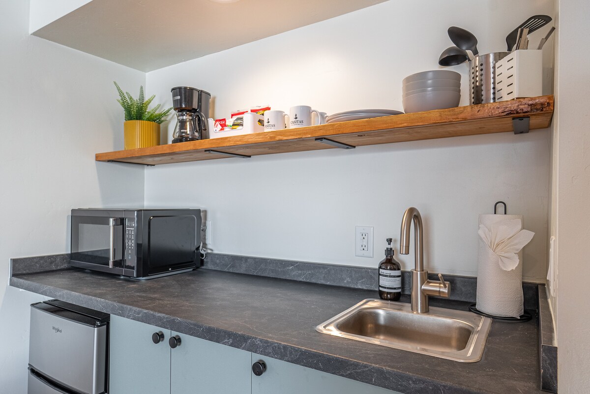 Enjoy our spacious remodeled casita rooms that include everything you'll need for a great stay! Memory foam mattresses, kitchenette (sink, mini-fridge, microwave, hot plate, coffee machine, basic dishes, pot&pan), smart TV, and walk-in closet. This room is designated as "Pet Friendly". Located within the heart of Torrey, Utah and just minutes away from Capitol Reef National Park - come make Casitas at Capitol Reef your home base for all of your adventures.