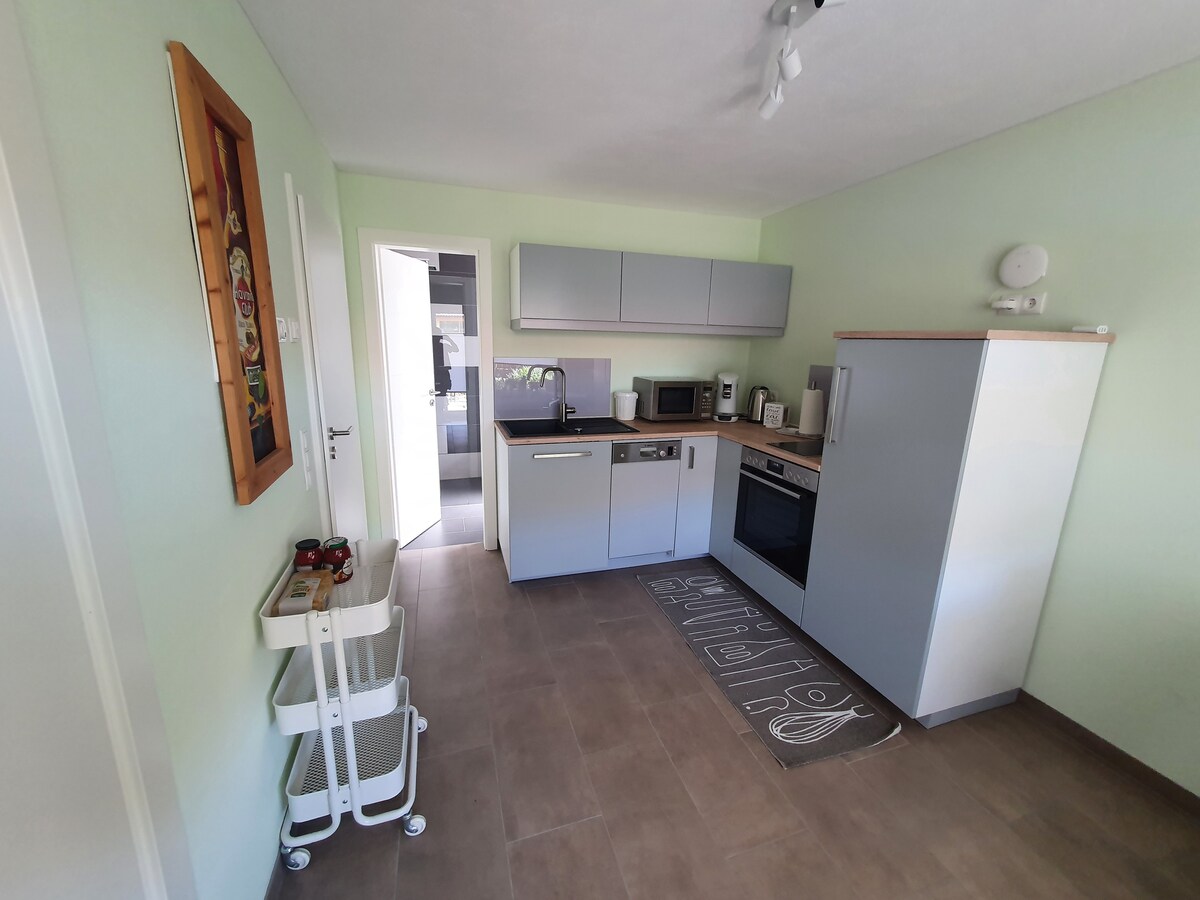 Our small 1-room apartment is modern and cozy. In the bedroom/study, there is a double bed and wardrobe as well as a workstation with an office chair and a flat-screen TV with an armchair. Feel free to use our guest Wi-Fi. The small bathroom is equipped to a high standard and has a walk-in rain shower. In the kitchen you will find everything for daily use (including dishwasher, stove, oven and microwave).