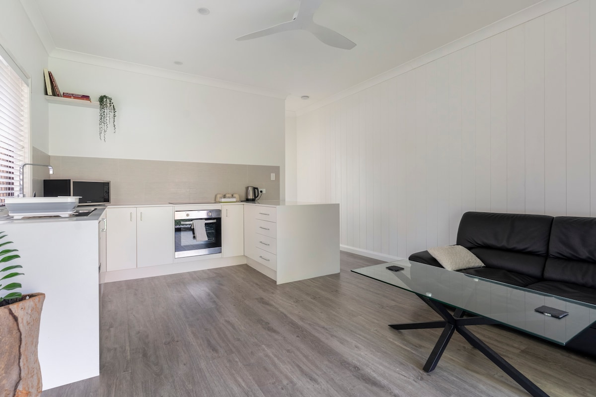 Our new, north facing Guesthouse is centrally located in an Ipswich heritage precinct. It has a separate bedroom and bathroom, a compact but fully equipped kitchen, dining and lounge areas. There are two outdoor areas for guests - just right for the morning winter sun or afternoon summer shade.