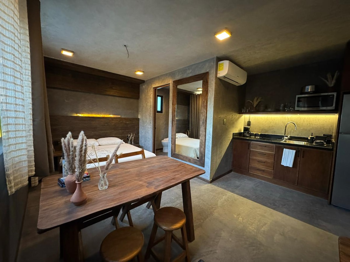 The second floor studio apartment at Hotel & Suites Oasis Bacalar is super practical, while also cozy and charming Your studio apartment has: - A Queen bed situated in a semi-separate area of the apartment - A fully equipped kitchen - Full size fridge, microwave, blender, toaster, plenty of pots/pans and various kitchen equipment - A hardwood dining table - A sitting area with a sofa and table. - A balcony with chairs and table, with view to the pool - Fast wifi - Tv with Roku. - Prime location!