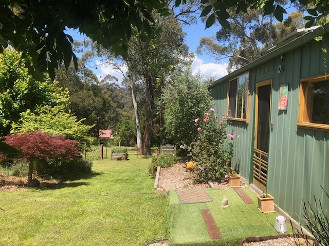The Little House on the Hill at the eastern end of Warburton overlooks the chooks, the veggie patch, the orchard and across the valley to gorgeous 270° views. It is next door to the Big House, set on an acre that slopes down to the Yarra River. A great swimming spot on hot days and a good way to access the town and the rail trail (five minutes there, maybe ten minutes return - uphill). There are plenty of lovely walks nearby including the Aqueduct Trail that starts further up the hill.