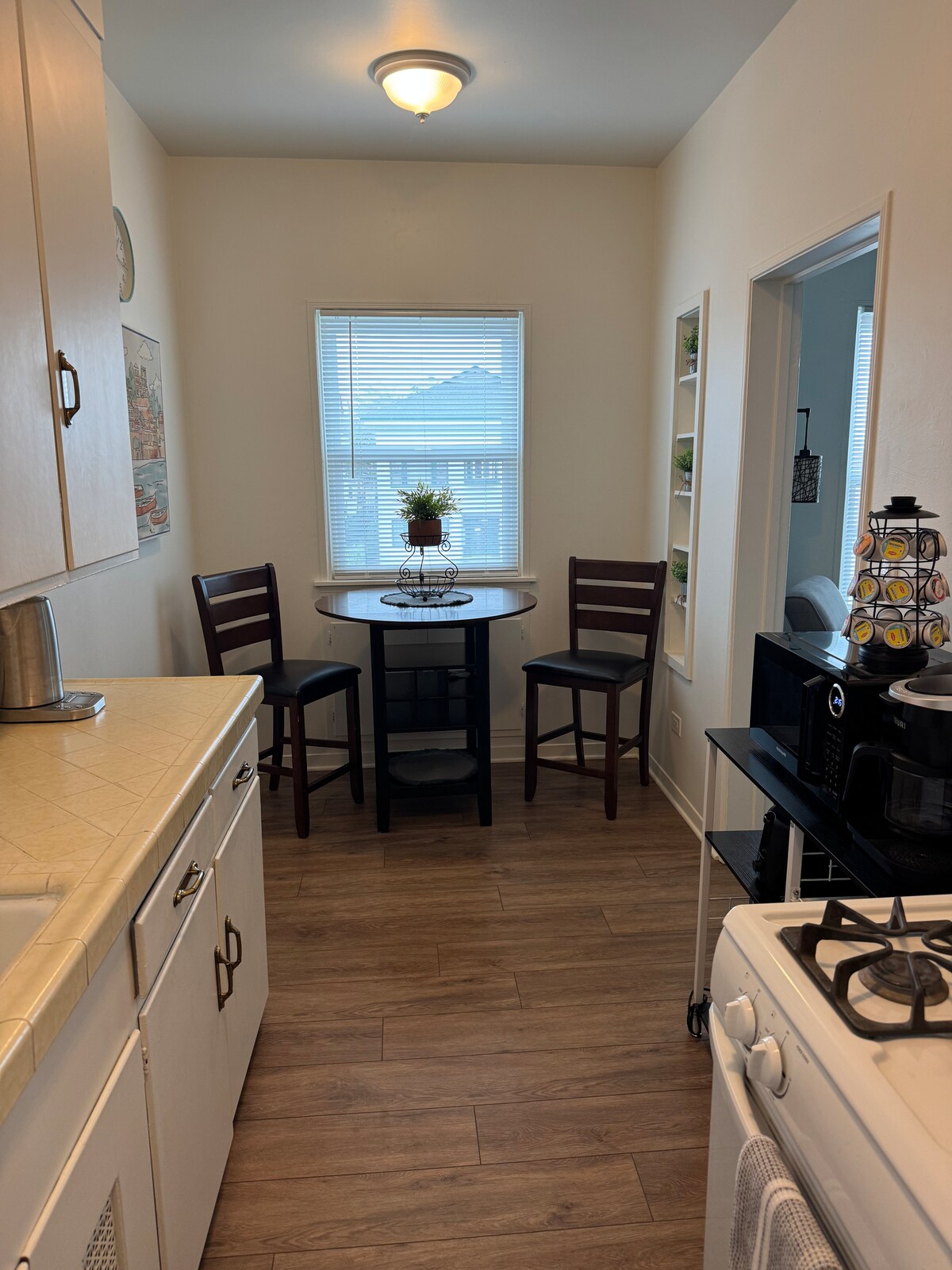This little suite has everything you will need! There is a kitchenette to include mini fridge, microwave, two burner stove, coffee maker, toaster oven, and toaster. The room has a queen bed, television w/Roku, closet, table, and chairs. There is a full bathroom with shower. The pool is not heated. It is serviced every Monday and open year-round for use. The suite is the back unit (unit #2). The garage parking is for unit #1 guests, however, you may use the washer and dryer.